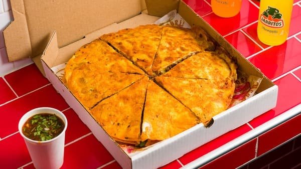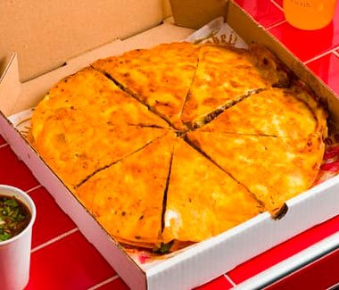 A shareable birria quesadilla pie cut into eight slices, loaded with birria and cheese, served with consommé. Perfect for gatherings.