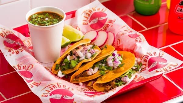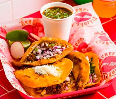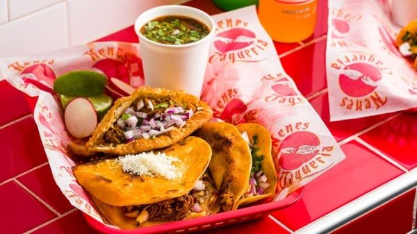 One birria taco, one birria mulita, one birria empanada, and a side of savory birria consommé. The full birria experience.